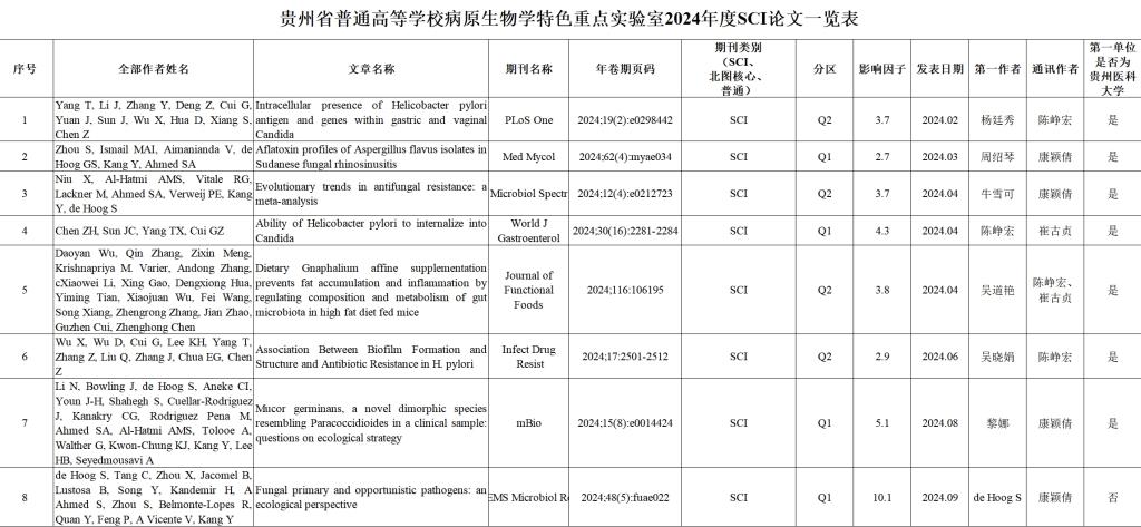 贵州省普通高等公司病原生物学特色重点实验室2024年度发表SCI论文8篇,总影响因子为36.3。