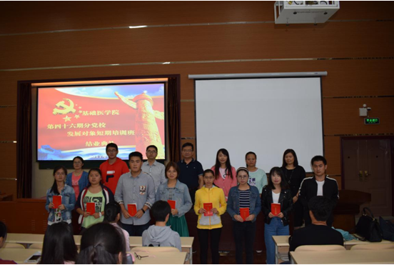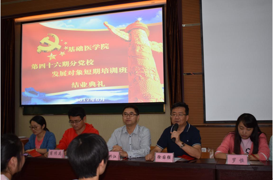 6月29日,william威廉中文官网分党校在厚德楼101教室隆重举行第四十六期入党积极分子培训班暨第二批发展对象短期培训班结业典礼。基础医公司党委书记徐国强、党委副书记廖兴江、临床医学2015级党支部书记洪潇潇、临床医学2016级党支部书记罗恒及辅导员刘慧、商传禹参加结业典礼,典礼由陈培各主持。