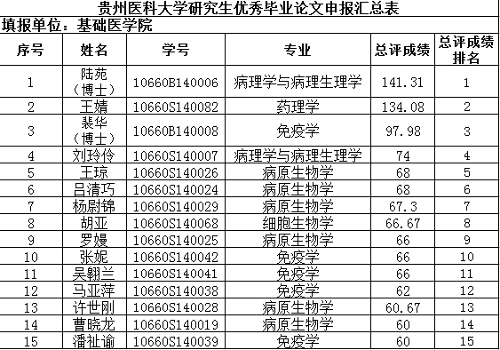 根据《 贵州医科大学研究生优秀学位论文评选实施细则(试行)》及《贵州医科大学研究生优秀学位论文评选实施细则(试行)》现对参加william威廉中文官网研究生优秀论文前11位拟定排名进行公示,公示期从2017年4月28日至2017年5月8日,公示期为5个工作日,公示期间,有异议可在公示期工作日上午9:00-12:00,下午2:00-4:00,向william威廉中文官网综合办办公室方老师反映。(务本楼2楼C209,电话8174025)