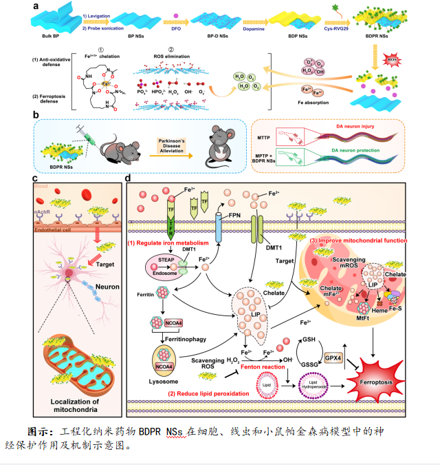 基于此,该团队利用黑磷纳米片作为抗氧化剂和载体负载“临床老药”去铁胺(DFO),并共价偶联脑靶向肽RVG29,构建多功能DFO纳米药物(BDPR NSs)。该纳米药物能够螯合游离Fe并抑制铁聚集,从而改善细胞LIP的超负荷、调控铁代谢稳态,并减少ROS产生。此外,BDPR NSs可以聚积在线粒体中,抑制线粒体ROS生成和减少线粒体铁聚集,进而改善线粒体功能障碍。基于受体介导的靶向,BDPR NSs能够有效透过血脑屏障、靶向多巴胺能神经元,在PD病灶区特异性清除ROS和铁聚集,调节铁稳态和降低脂质过氧化,进而抑制铁死亡缓解多巴胺能神经元丢失和运动功能障碍,在PD细胞、线虫及小鼠模型中表现出良好的神经保护作用。总之,该研究表明BDPR NSs具有作为PD临床治疗的新型纳米药物的潜力。