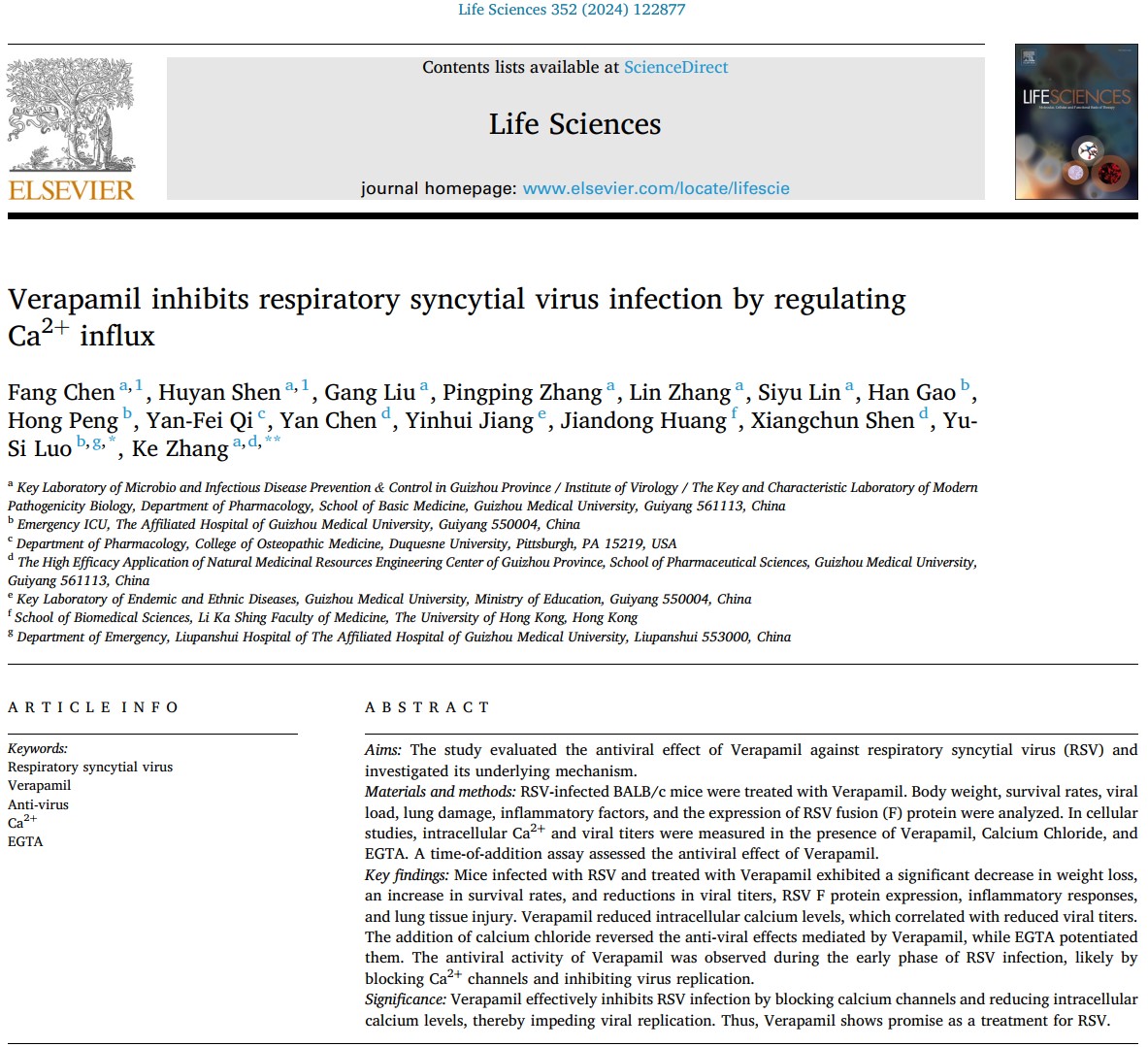 2024年6月,以我室张科副教授课题组硕士研究生陈芳、沈胡艳为共同第一作者,贵州医科大学附属医院罗语思主任医师和张科副教授为共同通讯作者,在JCR1区、中科院2区(top)期刊Life Sciences(影响因子:5.2)在线发表论著《Verapamil inhibits respiratory syncytial virus infection by regulating Ca2+ influx》(维拉帕米透过调节钙离子内流抑制人呼吸道合胞病毒感染)。