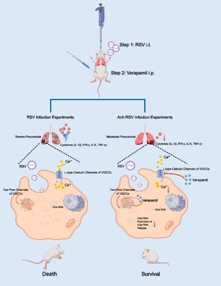 人呼吸道合胞病毒(RSV)是婴幼儿、老年人及免疫功能低下者急性下呼吸道感染的主要元凶,常引发急性毛细支气管炎和粘膜水肿。近年来,RSV的肺外表现如心肌损伤和心血管事件风险也备受关注,RSV感染的儿童常出现心律失常,包括多种心动过速和心脏阻滞。当前,治疗RSV感染的药物选择有限,利巴韦林疗效不稳定且毒性高,而帕利珠单克隆抗体虽有效但价格昂贵且适用群体有限。随着COVID-19的爆发,RSV的研究与治疗需求更加迫切。细胞膜离子通道在病毒复制及子代病毒释放中扮演关键角色,特别是钙离子通道被视为RSV感染治疗的新靶点。维拉帕米作为一种常用的心血管药物,通过阻断钙离子通道治疗心律失常和高血压。鉴于维拉帕米对其他病毒的抑制作用和钙离子在病毒复制中的重要性,本研究探索了维拉帕米对抗RSV感染的潜力,为RSV感染的治疗提供了新思路。课题组已向国家知识产权局提交了该项发明专利。