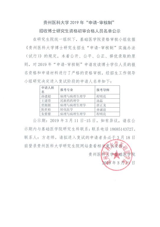 贵州医科大学2019年“申请-审核制”招收博士研究生资格初审合格人员名单公示