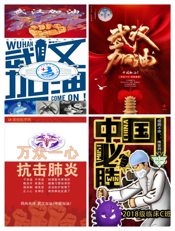 在这场没有硝烟的战争里,临床医学A、E、定向、基础医学班分别以海报展示我们拥有强大的祖国,团结的人民和坚定的信念,抗击疫情全民防控,团结一心,胜利终将属于我们。没有生而英勇,只有选择无畏。终有一日,雄狮轻起舞,英雄奋九州。