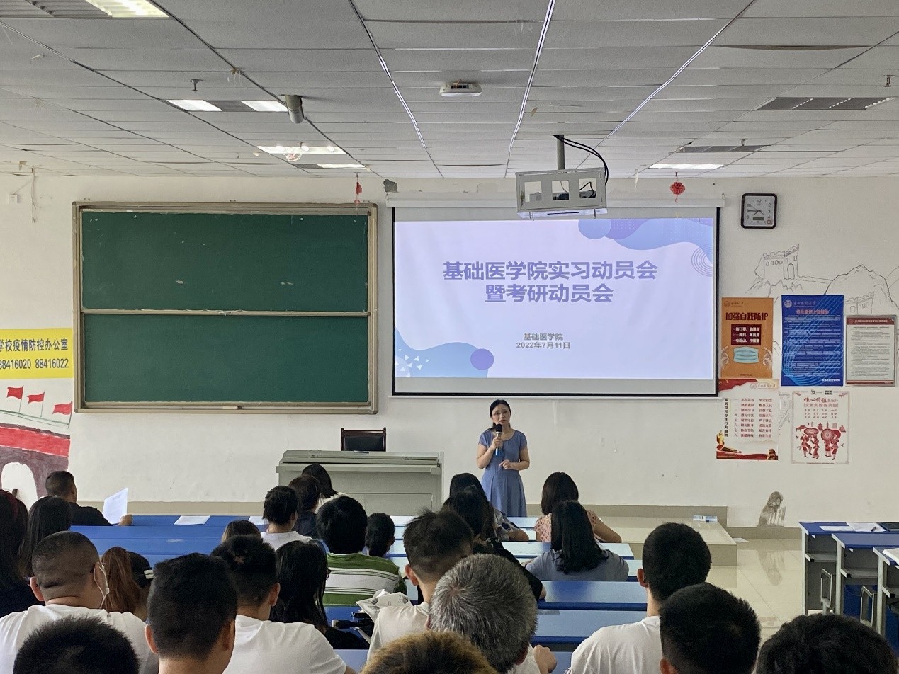2022年7月11日,william威廉中文官网在一栋教学楼1304教室召开2019级医学实验技术员工实习动员会暨考研动员会,基础医公司党委副书记张贤,副经理徐红,副经理张春林,教学科研管理科老师和2018级基础医学专业员工代表、2019级医学实验技术全体同学参加会议,毕业班辅导员刘旭主持。