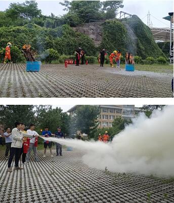 讲座结束后商红松工程师指导师生在网球场东侧空地进行实地演练,模拟当火灾发生时,如何正确使用灭火器。